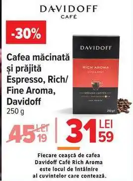 Acum în ofertă la Carrefour: Cafea măcinată și prăjită Espresso, Rich/Fine Aroma, Davidoff ✅ Valabil de la 18-03 până la 24-03.