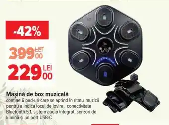 Carrefour oferă o colecție largă de produse, pe lângă Mașină de box muzicală. Fiți cu ochii în patru pe Catalog Carrefour săptămânal pentru a găsi cele mai bune oferte și promoții. Pe langa Mașină de box muzicală, mai puteti gasi si urmatoarele oferte: Minge fotbal Box One, Boxă portabilă Party Box 520 & Boxă Party Box Stage 710.