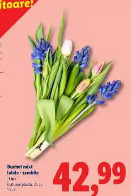 Acum în ofertă la Lidl: Buchet mixt lalele - zambile ✅ Valabil de la 23-02 până la 1-03.