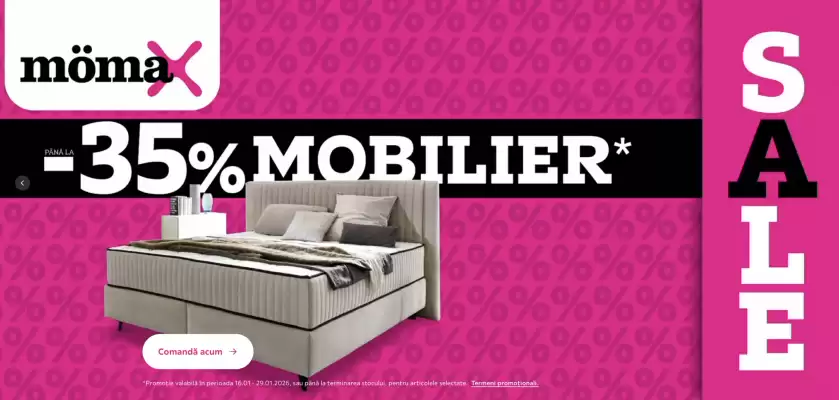 Mömax, parte a grupului XXXLutz, unul dintre cei mai mari retaileri de mobilă din lume, este o alegere modernă și accesibilă pentru amenajarea locuinței, prezent pe piaţa din România cu mai multe magazine fizice situate în Arad, Oradea și Timișoara dar şi un magazin online. Ofertele și promoțiile curente, precum și alte informații legate de produse sunt incluse într-un catalog Momax, actualizat lunar. De asemenea este disponibil și un catalog Momax săptămâna viitoare, în care sunt incluse oferte speciale, cu discounturi generoase, de până la 70%.