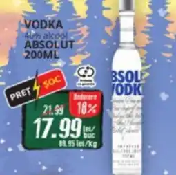| 1 | Vodka 40% alcool absolut 200 ml | Diana Supermarket | 21,99 RON | 17,99 RON | Reducere 18% | 03 ianuarie 2026 | 31 ianuarie 2026 | Vezi oferta | |