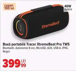 | 5 | Boxă portabilă Tracer XtremeBeat Ultra XtraVox XL TWS | Carrefour | 229,99 RON | 04 februarie 2026 | 17 februarie 2026 | Vezi oferta |