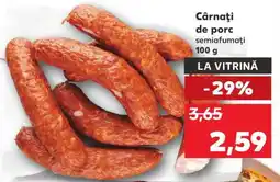 | Cârnaţi de porc semiafumaţi 100 g | Kaufland | 3,65 RON | 2,59 RON | -29% | 10 decembrie 2025 | 16 decembrie 2025 | |