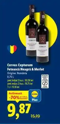 | Cervus Cepturum Fetească Neagră & Merlot | Lidl | 9,87 RON | 12 ianuarie 2026 | 18 ianuarie 2026 | |||