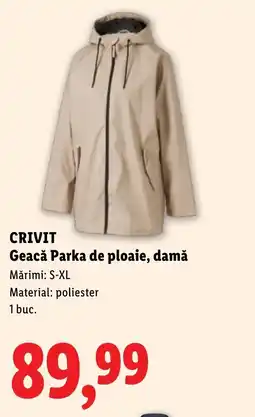 | CRIVIT Geacă Parka de ploaie, damă | Lidl | 89,99 RON | 09 februarie 2026 | 15 februarie 2026 | |||