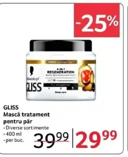 | 2 | GLISS Mască tratament pentru păr 400 ML | Selgros | 39,99 RON | 29,99 RON | -25% | 06 februarie 2026 | 19 februarie 2026 | Vezi oferta | |