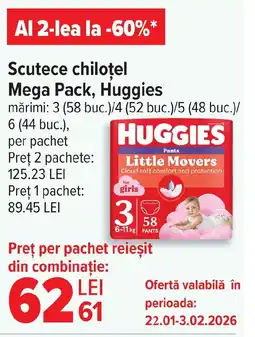 Huggies este un brand american de scutece și șervețele umede pentru bebeluși, renumit în toată lumea. Părinții aleg scutecele și șervețelele umede Huggies pe care bebelușii le iubesc, datorită conceptului inovator care stă la baza fabricării acestora. Produsele Huggies nu conțin clor, parabeni, alcool, parfum sau substanțe precum phenoxyethanol, sunt testate dermatologic și sunt hipoalergenice. Mai mult, sunt foarte confortabile pentru pielea sensibilă a bebelușilor, datorită tehnologiilor Huggies care definesc calitatea produsului, sistemul de protecție sau sistemul de prindere. Huggies produce o gamă diversificată de scutece, atât pentru fetițe cât și pentru băieței, de la scutece la scutece chiloțel, la scutece de zi, scutece de noapte, inclusiv chiloței pentru înot. Atât scutecele cât și întreaga gamă de șervețele umede, sunt disponibile în Carrefour, Auchan, Altex, rețele de farmacii precum Dr.Max, Spring Farma și multe altele, magazine specializate pentru copii și diverse platforme online. Urmăriți ofertele speciale, promoțiile și reducerile prezentate în pliantele, cataloagele și revistele prezente magazine. Oferta actualizată și completă a liniei de produse Huggies, vă așteaptă pe ofertelecatalog.ro. Alegeți scutecele Huggies, delicate cu pielea bebelușului.