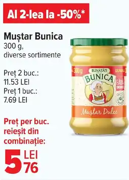 | 2 | Muştar Bunica 300 g | Carrefour | 5,76 RON | Al 2-lea la -50% | 14 ianuarie 2026 | 20 ianuarie 2026 | Vezi oferta | ||