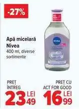 | Apă micelară Nivea | Carrefour | 16,29 RON | 28 ianuarie 2026 | 03 februarie 2026 | |||