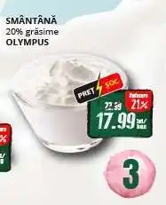 | OLYMPUS Smântână 20% grăsime 900 g | Auchan | 21,89 RON | 17,29 RON | -21% | 03 decembrie 2025 | 16 decembrie 2025 | |