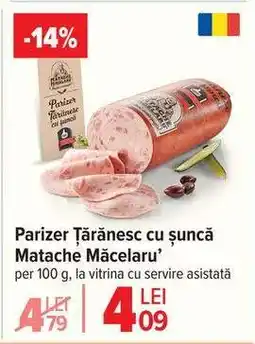 | Parizer ţărănesc cu șuncă Matache Măcelaru❜ 100 g | Carrefour | 4,79 RON | 3,99 RON | -16% | 14 ianuarie 2026 | 20 ianuarie 2026 | |