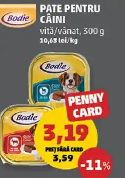 | Bodie Pate cu vânat pentru câini 300 g | Penny | 3,55 RON | 3,15 RON | -11% | 20 august 2025 | 26 august 2025 |