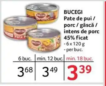 | BUCEGI Pate de pui / porc / gâscă / intens de porc 45% ficat | Selgros | 3,39 RON | 02 ianuarie 2024 | 25 ianuarie 2024 | |||