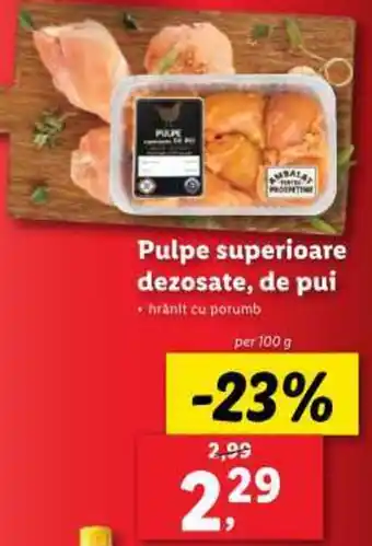 | Pulpe de pui dezosate per 100 g | Lidl | 2,29 RON | 1,69 RON | 0,60 RON Discount | 05 iunie 2023 | 11 iunie 2023 | |