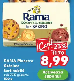 | RAMA Maestro Grăsime tartinabilă 500 g | Kaufland | 11,70 RON | 8,99 RON | Card -23% | 14 ianuarie 2026 | 20 ianuarie 2026 | |