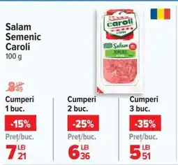 | Salam sandviş Caroli 100 g | Carrefour | 5,59 RON | 3,59 RON | -35% | 07 mai 2025 | 20 mai 2025 | |
