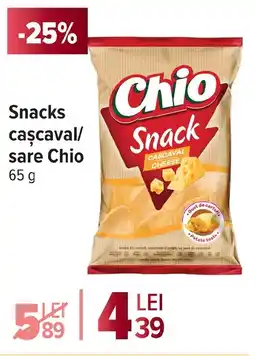 | 2 | Snacks caşcaval/ sare Chio 65 g | Carrefour Market | 5,89 RON | 4,39 RON | -25% | 27 decembrie 2025 | 07 ianuarie 2026 | Vezi oferta | |