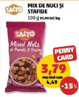 | Salto Mix de nuci și stafide 100 g | Penny | 4,49 RON | 3,79 RON | -15% | 22 octombrie 2025 | 28 octombrie 2025 | |